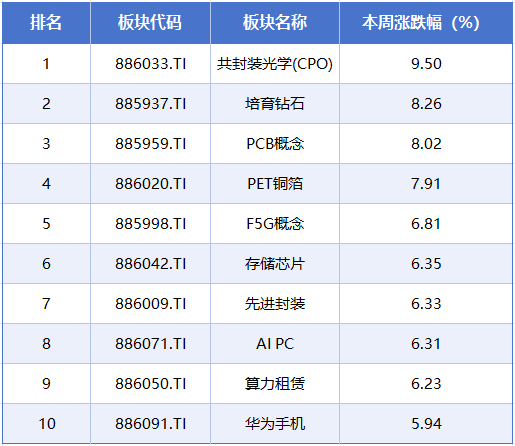 板块方面,本周涨幅居前的概念板块分别是共封装光学(CPO)、培育钻石、PCB概念、PET铜箔、F5G概念,累计涨幅分别为9.50%、8.26%、8.02%、7.91%、6.81%。