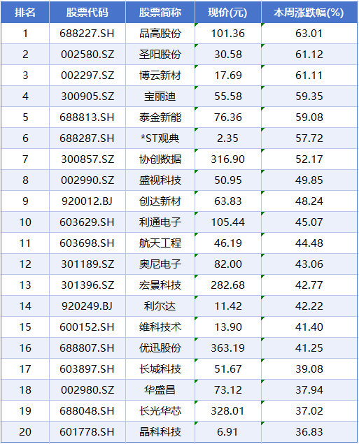 个股方面,本周个股涨幅榜前五位分别是品高股份、圣阳股份、博云新材、宝丽迪、泰金新能,累计涨幅分别为63.01%、61.12%、61.11%、59.35%、59.08%。