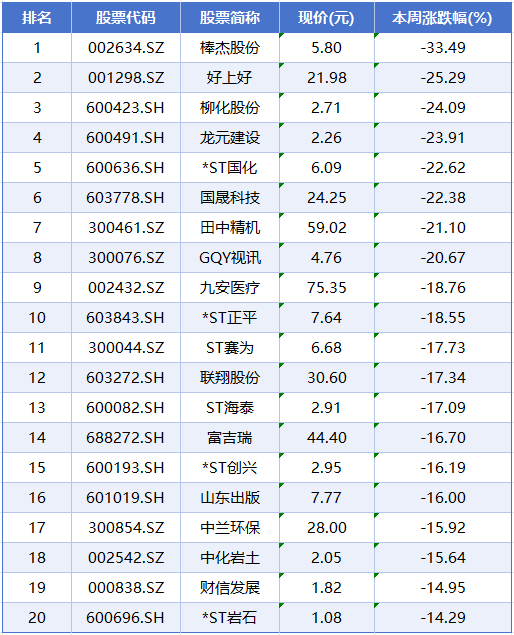 本周个股跌幅榜前五位分别是棒杰股份、好上好、柳化股份、龙元建设、*ST国化,累计跌幅分别为33.49%、25.29%、24.09%、23.91%、22.62%。