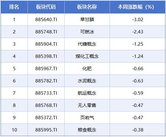 本周排在跌幅榜前排的概念板块分别是草甘膦、可燃冰、代糖概念、煤化工概念、化肥,累计跌幅分别为3.02%、2.43%、1.25%、1.24%、0.66%。