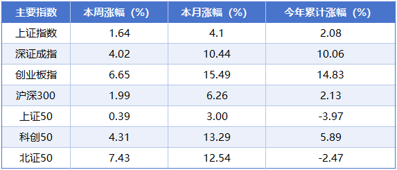 本周(4月13日至4月17日),A股三大指数延续反弹走势。截至周五收盘,上证指数累计上涨1.64%,深证成指累计上涨4.02%,创业板指累计上涨6.65%。
