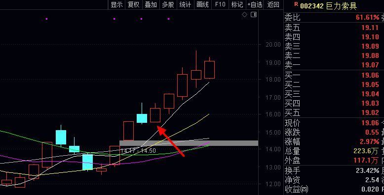 还有红色箭头那天唯一信号的巨力索具,也是连续4天涨,所以这个公式是真心无私奉献的,大家运用好后发现股市根本不缺机会,剩下的就是心态和仓位问题,控制的好话其实慢慢积累利润是容易跑赢大盘的,但是需要耐心。而且注意禁止单吊,至少保持2--3只内,这样1个洗盘,1个涨,比如15号尾盘入的金富科技,次日收小涨阴线洗盘,但是15号同一天你尾盘关注奥瑞德的话,次日收获涨停10%,然后出掉,然后次日尾盘2跌补仓金富科技,这样来回吃涨停,所以洗盘是机会,前提必须是中线模式,欢迎加入VIP送选股公式。