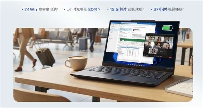 续航焦虑一直是轻薄本用户的痛点,而ThinkPad X14 2026在这方面给出了令人信服的答案。它内置74Wh高密度电池,实验室测试支持15.5小时超长续航与37小时视频播放,足以覆盖跨城差旅的全天候使用需求。设备更配备1小时快充至80%的闪充技术,利用午休时间即可恢复充沛电力,让生产力真正全天在线。