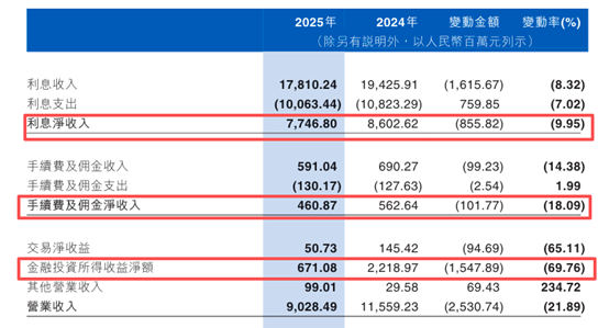 拆解收入结构,利息净收入、手续费及佣金净收入、金融投资收益这“三驾马车”在2025年集体失速。