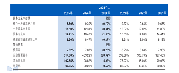 与此同时,流动性指标波动较大。截至2025年末,该行流动性覆盖率从2024年的403.22%骤降至314.30%,跌幅近90个百分点。这一指标的显著回落,意味着银行短期优质流动资产对短期负债的覆盖能力减弱,短期流动性风险的防御屏障有所变薄。