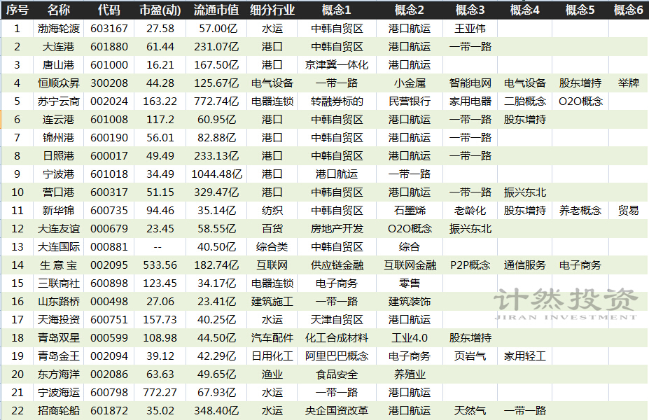 下面的统计涉及“中日韩首脑峰会”概念的个股,为各位投资者提供参考。这些中日韩首脑峰会概念股本身实用价值有限,而一个伟大的题材往往是复合题材,计然投资将基于整理的概念股数据库,对各个概念不断跟踪,寻找题材碰撞爆发出的力量。