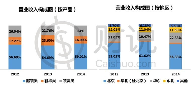 公司2014年营业为2.87亿元,同比增长0.19%,公司受电子商务和商场渠道冲击,2014年净利为2709.8万元,大幅下滑14.59%。从营业收入构成上来看,服装类产品占比最大,且近六成收入来自北京地区。