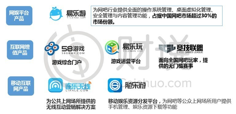 成立于2009年11月,公司主要从事互联网娱乐平台的设计、开发、推广以及基于此平台上的网络广告推广及互联网增值服务相关业务。公司针对网吧渠道设计推出的“易乐游网娱平台”产品,公司旗下产品易乐游网娱平台在网吧游戏更新软件市场份额均位居行业第二位,所占市场份额达37.7%,覆盖网吧数量超5万家。公司在网吧渠道的主要竞争对手为顺网科技的网维大师。