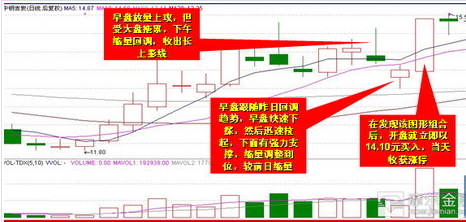今天再次出现类似组合,昨日随奥飞动漫涨停拉升,做出上引线后冲高回落,今日顺势低开,全天低位横盘震荡,让短线客被迫出局,盘中小单对倒吸筹,为后续拉升做冲刺准备。