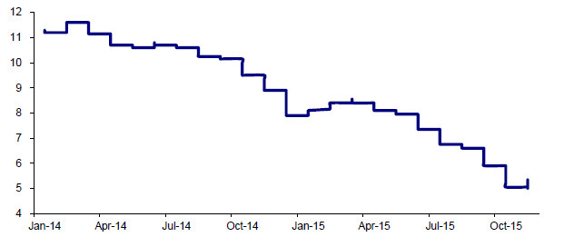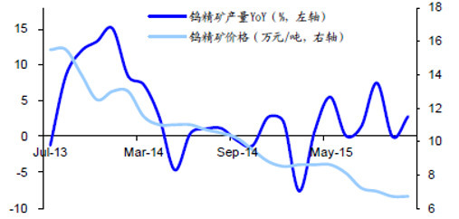2015 年1-3 季度钨精矿均价分别为8.26、8.01 和6.63 万元/吨,3 季度均价同比下降57.72%,环比下降20.81%。当前价格为5.35 万元/吨,钨价处于绝对底部。